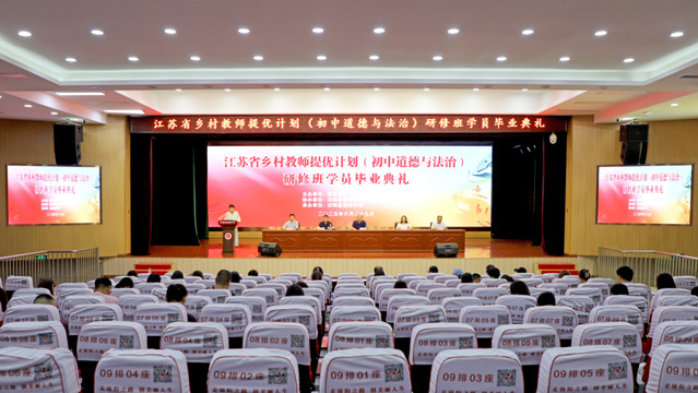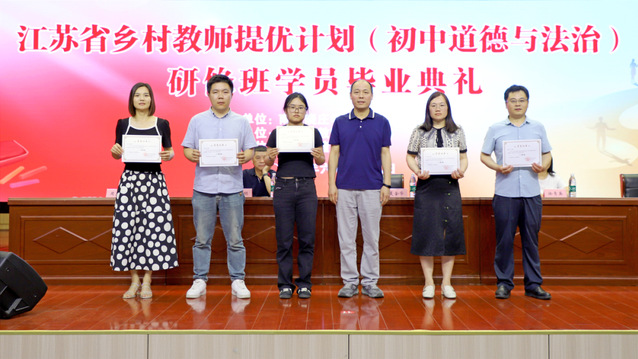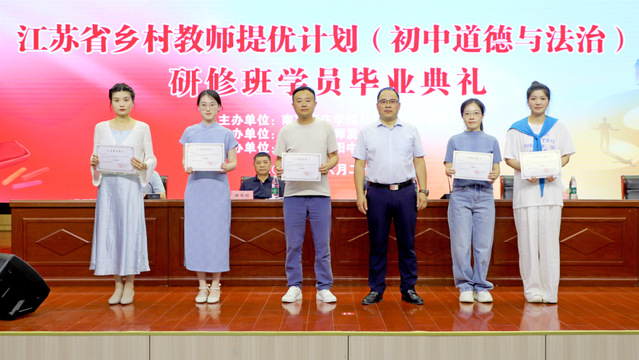 6月29日下午,研修班毕业典礼在沭阳县潼阳中学报告厅隆重举行。它既是对研修成果的集中展示,更是对教育初心的生动诠释。典礼通过颁奖仪式、学员分享、领导讲话等环节,全面回顾了为期两年的研修历程。我院思政教研室主任夏金华、副教授徐青英,宿迁市初中政治名教师、宿迁市初中道法名师工作室主持人、沭阳县教师发展中心科研部主任田作明,沭阳县潼阳中学校长李健等领导专家出席典礼,与全体学员共同见证这一重要时刻。