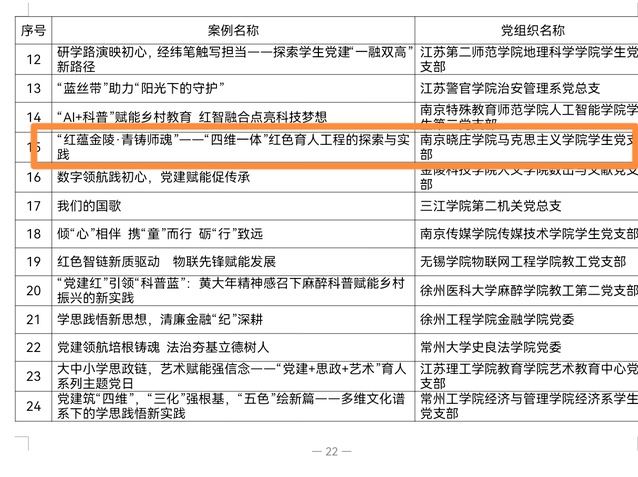 近日,省委教育工委公布了2023-2024年度江苏高校党建工作创新案例名单,我院党委报送的学生党支部党建工作案例《“红蕴金陵·青铸师魂”——“四维一体”红色育人工程的探索与实践》榜上有名,获评活动创新类案例二等次。