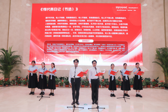 活动现场,我院8名学生声情并茂地诵读了中国共产党早期青年运动领袖恽代英的日记(节选)以及现代诗《渡江战役颂》。